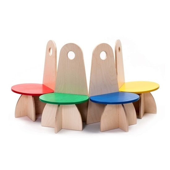 - Vier kleurrijke stoelen: De rode, gele, blauwe en groene stoelen voegen een speelse en levendige sfeer toe.
