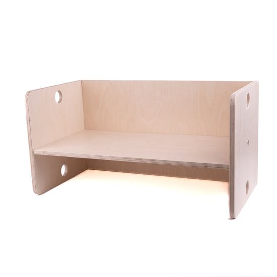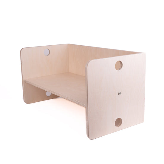 De kubusbank heeft verschillende zithoogtes, zodat hij met je mee kan groeien. Het is gemaakt van hoogwaardig multiplex en is draaibaar als tafel.